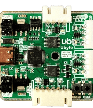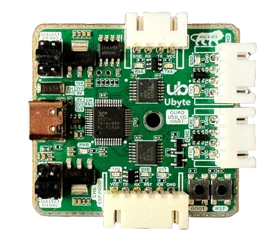 The Quad Channel USB-to-UART Converter is a versatile and high-performance interface designed for applications requiring multiple UART connections over a USB interface. It integrates the USB-to-Quad UART bridge, providing four independent serial channels with adjustable voltage levels (1.8V, 3.3V, and 5V).